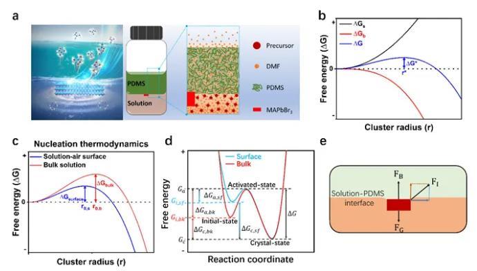 图1. MAPbBr3钙钛矿结晶与晶体生长。(a) PDMS辅助结晶原理图;(b) 形核半径与自由能的关系;(c) 溶液的表面和内部的形核半径的比较;(d)生长过程中自由能变化图解;(e)界面悬浮生长的力学图解。