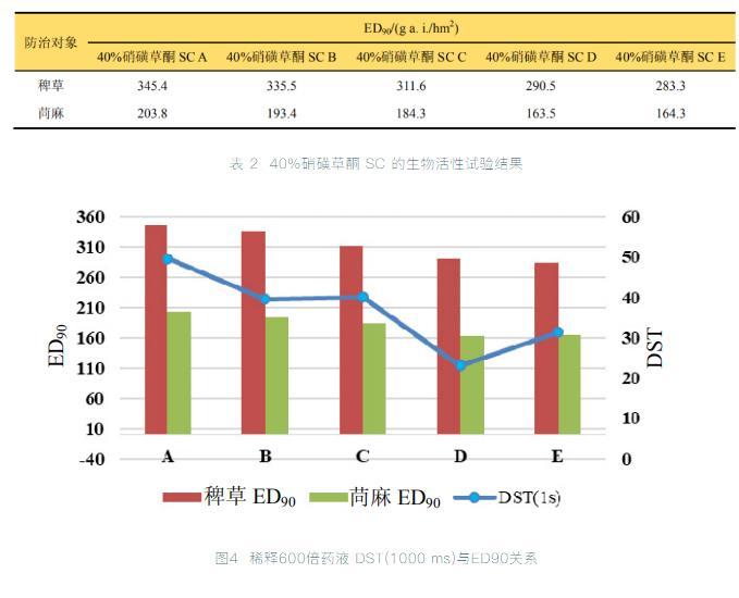 通过对480 g/L硝磺草酮悬浮体系制剂的研究,进而测定5个不同制剂配方的3种稀释浓度液的动态表面张力,研究防治效果与动态表面张力的关系。结果显示无论对禾本科还是阔叶杂草,悬浮体系药液的动态表面张力的变化趋势,在一定程度上与其药效正相关。