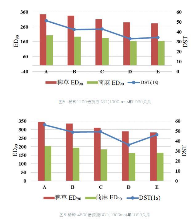 对于除草剂而言,药液表面张力低于植物叶面润湿临界值大概25 mN/m,药液就可以由气孔直接渗入表皮。对于稀释600倍条件下,D配方的动态表面力为23.14 mN/m,已经低于杂草叶面的临界值,那么药液势必更有效地渗透,药效会更高,尤其对于叶片厚,蜡质层稍厚的阔叶杂草会更加明显。对于稀释600倍条件下,E配方的动态表面张力为31.28 mN/m,略高于叶面的临界值,可能对于阔叶杂草的防效会有所下降。把药液表面张力与靶标表面张力关联,可以初步看出,药液表面张力越接近杂草叶面临界表面张力值,药液防效会越优秀,当偏离程度大时,除草活性会受到明显影响。