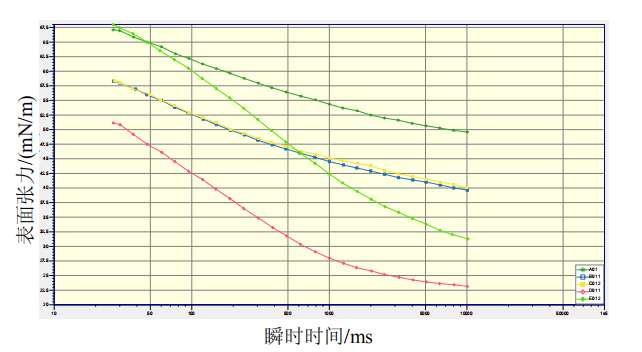 通过检测不同制剂配方的药液动态表面张力,以达到药液有效快速附着、润湿叶片的目的,来提升药效。通过分析30 ms到1000 ms内,稀释药液在表面吸附期的动态表面张力迅速变化,来初步判断药液与杂草叶面的接触和润湿情况。最终结合室内药效数据,来研究药液动态表面张力与药效关系。