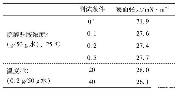 某学生自制烷醇酰胺不同测试下表面张力测试值,如表1所示。合成的烷醇酰胺具有较强的表面活性。25℃下纯水表面张力为71.9℃mN/m。当50 g水中加入0.1 g烷醇酰胺时,其表面张力显著降低,为27.6 mN/m。当增至0.2 g时达到最低值(27.4 mN/m),继续增加,反而略有增加。上述结果表明,0.2 g烷醇酰胺加入量已达到其CMC浓度。同样,在最佳浓度下(0.2 g/50 g水),随着测试温度的升高,烷醇酰胺水溶液表面张力降低。