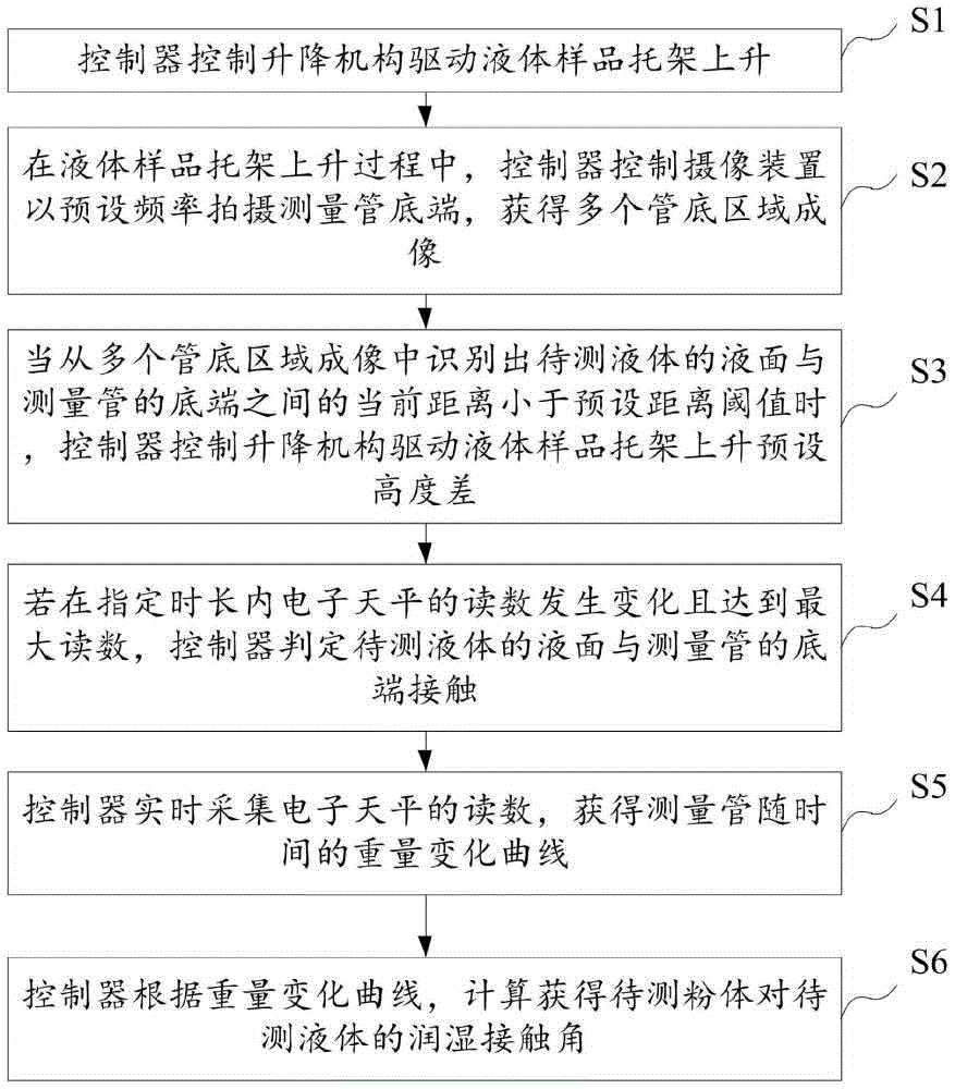 粉体材料润湿接触角测量方法应用于蜜桃AV免费观看,所述蜜桃AV免费观看包括壳体以及设置于壳体内的电子天平、底端用微孔板封闭的测量管、液体样品托架、升降机构和摄像装置;所述电子天平的底部设置有连接杆,所述连接杆与所述电子天平的称重盘固定连接,所述测量管垂直悬挂于所述连接杆下方,所述测量管的底端位于所述摄像装置的摄影取景范围中,所述测量管内装有待测粉体,所述液体样品托架用于固定装盛有待测液体的样品容器,所述液体样品托架由所述升降机构驱动升降;所述测量方法包括: