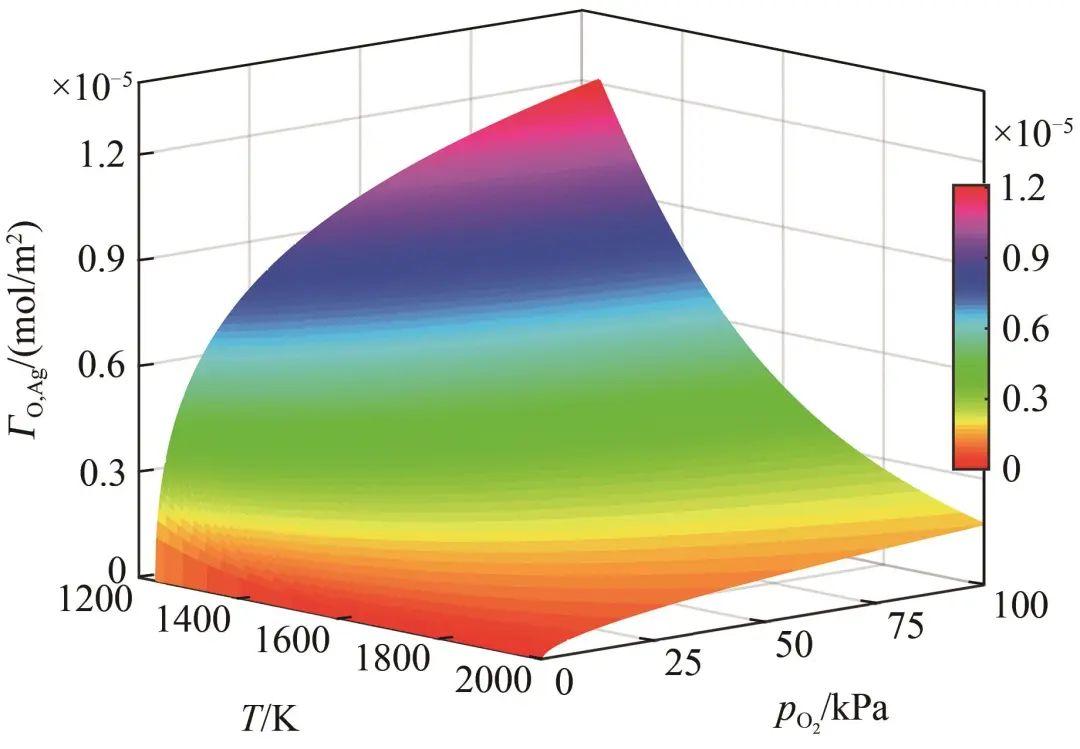 由图7可知,当温度低于1500 K时,ΓO,Ag随氧气压力升高显著增加;当温度高于1500 K时,由于液态Ag-O系中的氧溶解度显著降低,ΓO,Ag随氧气压力的增加,其增加幅度减小。观察图8可知,η随着温度和氧分压的升高而呈现下降趋势。这是因为式(27)中的表面偏析平衡系数KII与温度呈负相关,当温度升高时KII减小,导致表面氧浓度降低。此外,在较低的氧分压条件下,O原子倾向富集于表面;当氧分压升高时,更多的O原子溶入液态Ag-O系中,引起η减小。