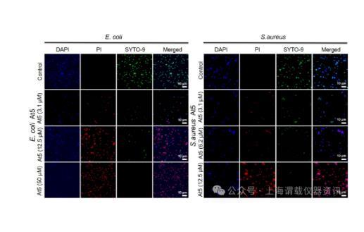 图5、大肠杆菌和金黄色葡萄球菌在37°C下用不同浓度的At5肽处理2小时前后的活/死染色(×100放大倍数,比例尺=10μm)。