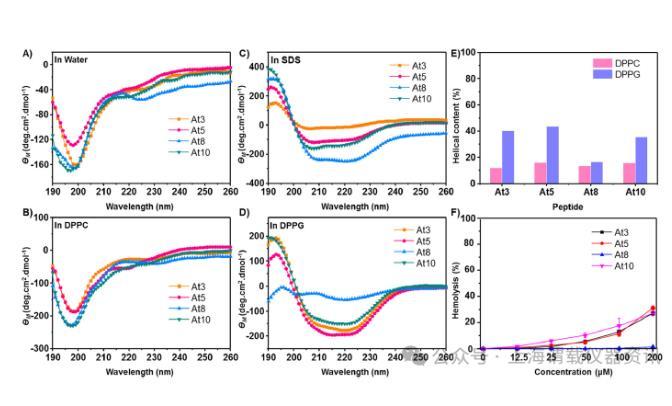 图2、设计肽的二级结构和溶血特性。(A)水、(B)25 mM SDS、(C)两性离子DPPC SUV(0.25 mg mL-1)和(D)带负电荷的DPPG SUV(0.25 mg mL-1)中肽的CD光谱。所有四种肽(At3、At5、At8、At10)在水和DPPC SUV中均呈现无规卷曲结构,而在SDS和DPPG SUV中均采用螺旋结构。肽浓度固定在0.1 mM。所有测量均在室温下进行。(E)DPPC和DPPG SUV中肽的α-螺旋含量。(F)肽的溶血活性。用不同浓度的肽处理人红细胞(hRBC)并在37°C下孵育1小时。然后在OD540nm处测量吸光度。