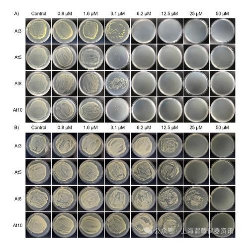 图1、用于确定(A)大肠杆菌和(B)金黄色葡萄球菌中肽的最低杀菌浓度(MBC)值的细菌培养物。