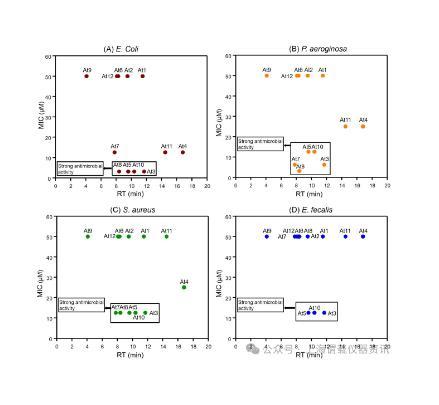 图3、设计的抗菌肽的疏水性由它们的HPLC保留时间确定,与它们对不同菌株(A)大肠杆菌、(B)铜绿假单胞菌、(C)金黄色葡萄球菌和(D)大肠杆菌的抗菌活性之间的关系。