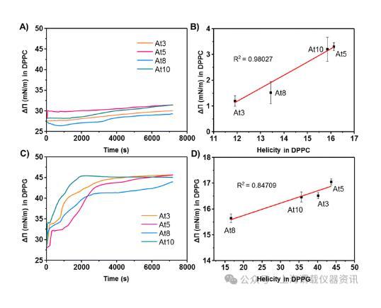 图4、(A和C)在亚相中注射抗菌肽后DPPC和DPPG脂质单层的表面压力变化。(B和D)分别在注射抗菌肽(AMP)后DPPC和DPPG脂质单层表面压力的增加与DPPC和DPPG中AMP的螺旋度之间的相关性。注射抗菌肽后两性离子DPPC脂质单层表面压力的增加非常小,而阴离子DPPG脂质单层表面压力的增加相当高。