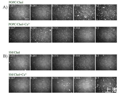 图3、(A)POPC/Chol单层膜,(B)SM/Chol单层膜的BAM图像(Chol摩尔比为0.167;0.285;0.375;0.444和0.5),存在或不存在Ca2+,在35±2°C。白色比例尺=100ϻm。