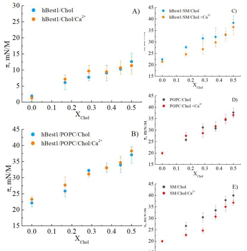 图1.胆固醇对(A)hBest1、(B)hBest1/POPC、(C)hBest1/SM、(D)POPC和(E)SM单分子层的凝聚效应(Chol的摩尔分数为0.167;0.285;0.375;0.444和0.5)在存在或不存在Ca 2+的情况下,在35±2°C。数据表示为平均值±SE,n=7。