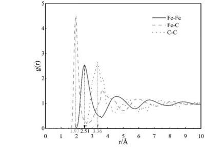 Fe-C二元体系经计算得到的径向分布函数,Fe-Fe、Fe-C、C-C原子对的平均键长分别为若原子间距离小于相应的键长值则表示两个原子之间互相连接,根据碳原子连接的铁原子个数,可将铁原子区分为自由态铁原子(与碳原子没有配位关系)、A型铁(只与1个碳原子形成配位关系)、B型铁(与2个或更多的碳原子形成配位关系)三种类别,根据模拟结果数据可对铁原子的配位方式进行分析。
