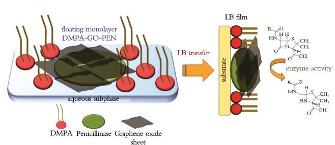 此外,将经典两亲分子的Langmuir单层与酶结合是保持生物大分子催化性能的一种方式。F.A.SCHLL等研究了磷脂LB膜固定化青霉素酶(PEN),将GO加入青霉素酶‐脂质Langmuir单层膜中,并作为LB膜转移到固体载体上,评估了酶的催化性能(见图3)。结果表明,GO作为由2,2‐二羟甲基丙酸(DMPA)和PEN组成的LB膜的添加剂,被固定在LB膜的PEN中;GO存在于酶脂LB膜中,不仅可以调节青霉素酶的催化活性,而且有助于数周后仍保持其酶活性。研究结果加强了混合纳米结构薄膜的重要性,证明了使用由脂质、GO和酶组成的LB膜应用于光学生物传感器的可行性,对应用传感器的生物电子设备研究具有重要意义。