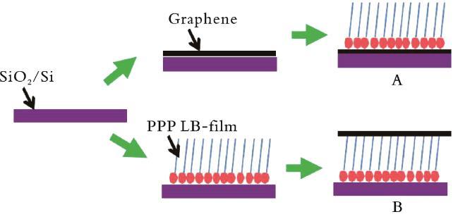 石墨烯作为一种新型二维超薄碳材料,易于吸附分子,是天然的衬底。当某些分子吸附在石墨烯表面时,分子的拉曼信号会得到明显的增强,这种拉曼增强效应被称为石墨烯增强拉曼散射效应(GERS)。X.LING等为了进一步证实GERS中的化学增强机制,使用LB技术构建了原卟啉Ⅸ(PPP)的单层或多层有序聚集体以及与石墨烯接触的PPP的可控分子构型(见图1)。