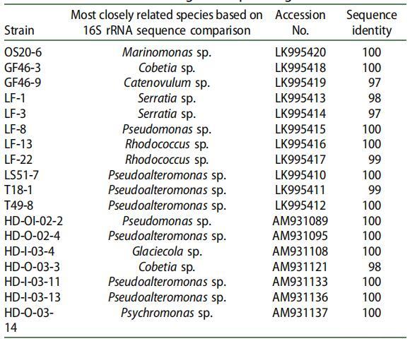 通过 16S rRNA 基因序列分析对具有显着 SAC 活性的 18 个分离株进行分类鉴定(表 2)。 红球菌除外。 菌株 LF-13 和红球菌属。 在菌株 LF-22 中,大多数鉴定的 SAC 生产者是革兰氏阴性菌,属于 γ-变形菌纲。 也有报道称 γ-变形菌在寒冷海洋地区的石油污染地点占优势。 [21-24] 先前对石油污染地点的研究表明,假单胞菌、假交替单胞菌、冰川、海藻和红球菌是极地、海洋区域。[21,22,25-28]