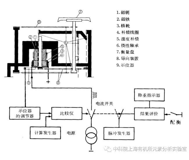 电子天平的结构原理如上图所示。包括衡量盘在内的载荷接收装置由两对三角形导向装置控制,衡量盘只能进行垂直运动。磁铁装置由永久磁铁组成,磁轭和极靴连接在载荷接收装置的最下端,补偿线圈放在磁铁装置的空气间隙中。如果电流流往线圈,线圈中就产生直接向上的力,这种力作用于衡量盘上的重力。光电扫描装置使这种力能辨别载荷接收装置预先规定的中心位置。如果载荷有变位,调节器及其放大器就改变流经线圈的电流,直到回到中心位置为止。在小载荷的情况下,电流通过时间短,载荷大时电流停留的时间长。通电流的时间间隔是通过平衡位置扫描的可变增益放大器来调节的,而且这种时间间隔直接与载荷成正比。这样,当用加载的方式接通电流时,就用计算器计算脉冲。当测量结束时,计算器指示其结果。概况来说,电磁力平衡式电子分析天平是把待测物的质量通过电磁力平衡原理变换为电流检测,再经电流/电压变换、模/数转换和数字化运算处理,用数字显示待测物的质量值。