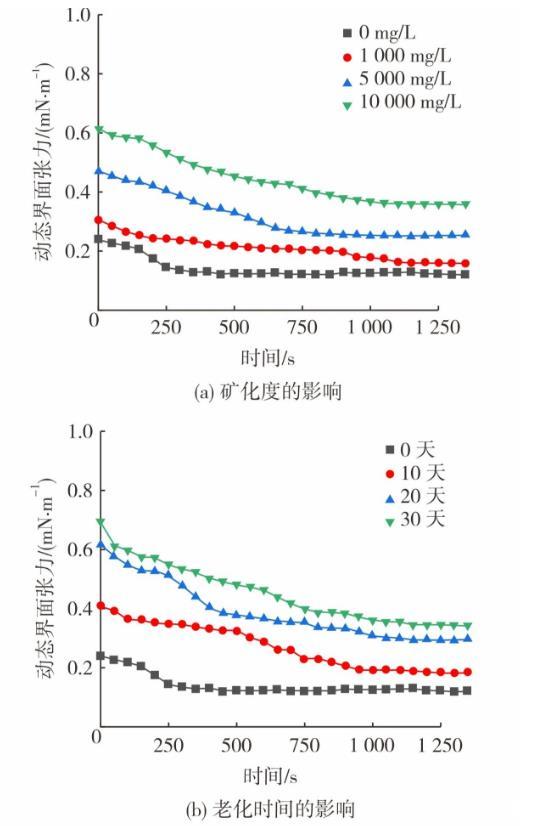 将体系(0.06%(w)冻胶分散体+0.10%(w)降黏剂)置于50℃条件下老化,模拟长期的调驱过程。图3(b)和图3(d)为老化时间对体系界面流变性质的影响。从图3可知,随着老化时间的增加,体系的动态界面张力稳定值增加,同时界面扩张模量减小。在老化过程中,降黏剂分子的界面活性逐渐减弱,导致降黏剂的有效吸附含量降低,使得动态界面张力增加。此外,由于老化后冻胶分散体聚结沉降在底部,体系黏度降低,降低了界面扩张模量。总体来看,老化后的体系对稠油的乳化能力略有下降。
