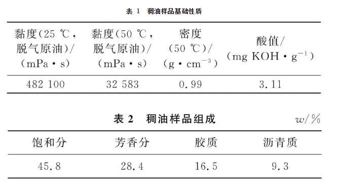 实验所用材料:冻胶分散体,实验室自制[18];稠油冷采降黏剂,上海诺颂实业有限公司;实验用模拟地层水矿化度8 000 mg/L(NaCl与CaCl2质量比为9∶1);所用稠油样品为胜利油田河口采油厂的特超稠油,油藏温度为50℃,样品基础性质及组成见表1和表2。
