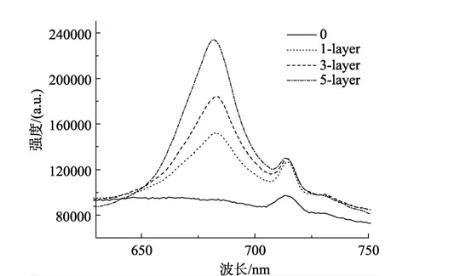图4不同层石莼类囊体膜LB膜在纳米ZnO上的室温荧光发射光谱,436 nm激发