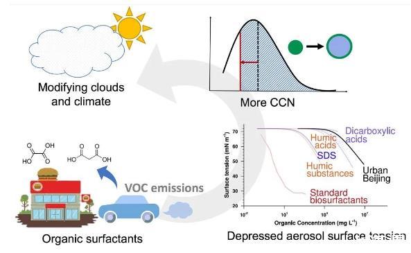 研究进一步表明,忽略表面张力降低效应将导致在云中典型过饱和度范围内(0.23%-0.76%)超细云凝结核(直径<100 nm)的数浓度降低6.8%-42.1%。综上所述,本研究提供了有机物降低城市气溶胶表面张力的新证据,表面张力的降低将增加云凝结核的数量,从而影响云和气候(图3)。