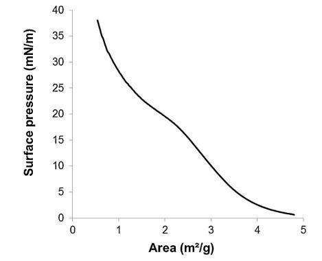 图 3. 表面压力-面积 (?-A) 等温线形成于 通过传播精浆形成空气/缓冲液界面(n = 3,标准偏差 在 0-18.9 mN/m 范围内不超过 1.5 mN/m,在 1.2 mN/m 范围内不超过 18.9–38 mN/m)。