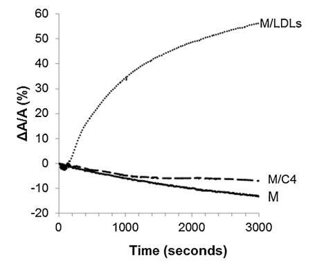 图 4. 被覆盖的界面的相对表面积随时间变化 单层 (M) 以 25 mN/m 压缩并在含有 (——) 没有额外的分子,(...) LDL(4.6 毫克 PC)和(—)脂质体 C4(含有 4.8 毫克 PC)。 空气-缓冲液界面的温度为 34°C。