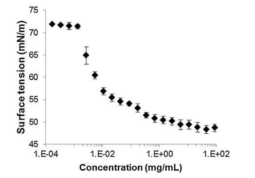 图 2 牛气水界面表面张力(±标准差) 精浆溶液中所含蛋白质浓度的函数 提取并以对数刻度表示 (T = 23.2 ◦C ± 0.3 ◦C, n = 2, 4 次重复 每个样品)。