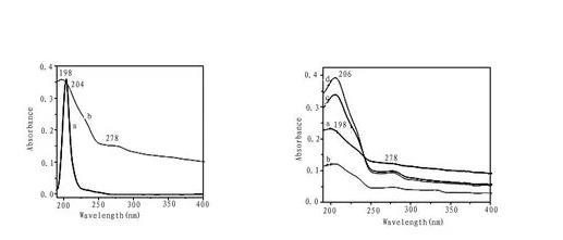 图4化合物1氯仿溶液(a)和LB膜(30层)的紫外光谱(b)(左图),在不同亚相(a)纯水,(b)乙二酸,(c)丙二酸,(d)丁二酸时转移30层膜的紫外光谱(右图)