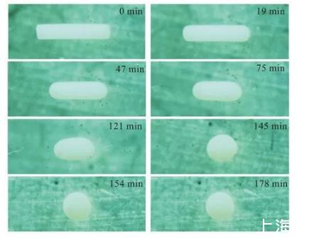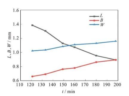 可以看出,从121 min开始,可以观察到椭球形液滴已经初步形成,即从121 min开始计算椭球形液滴的三轴长度,根据实验装置图,L和B为x和y方向的液滴长度,W为z方向的长度,根据公式W=R03/(LB)计算得到。