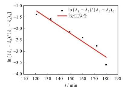 通过实验可以得到L和B的时间演化,界面张力可以通过ln(λ1-λ2)/(λ1-λ2)0~t的斜率求得。通过软件拟合出的形状因子随时间演化的图形如图5所示。利用式(1)~式(3)计算得到,PS/POE体系在230℃时系统的界面张力为0.397 mN/m。