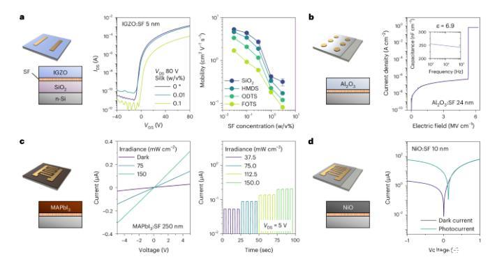 图4展示了使用SF表面活性剂在憎水表面上制造水基纳米器件的过程及其特性。研究发现,SF的自分离特性在不影响器件性能的情况下,保证了薄膜的质量和功能。在含有0.03 w/v%SF的IGZO晶体管中,迁移率保持在1至10 cm²/V·s之间,只有在SF浓度超过0.1 w/v%时才略有下降。即使在疏水性表面上,SF的存在也没有显著影响电荷迁移率或引起非理想状态(图4a)。在电介质材料中,SF掺杂的Al2O3薄膜显示出良好的电气性能(图4b)。SF还被成功应用于制造基于MAPbI3和NiO的光电薄膜,这些薄膜在光照下产生光电流(图4c,d)。相比商用表面活性剂,SF用量更少且对器件性能影响更小,并具有生物友好性,适用于生物活性传感器和人机电子界面等领域,展示了在环保和经济效益上的优势。