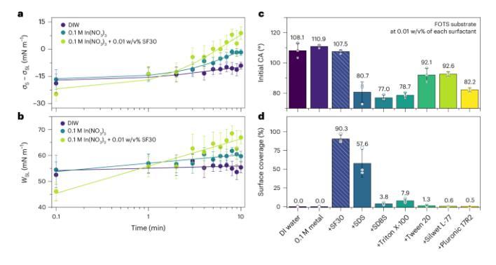 润湿是液体在固体表面扩散以最小化自由能的现象,其效果通过界面张力和粘附功来定量评估。实验显示,添加SF30(煮沸30分钟的丝蛋白)到水溶液中,尽管表面张力与对照组相似,但显著降低了疏水性基底上的接触角(CA),表明润湿增强是由液固界面能的改变引起的,而非溶液表面能的变化(图2a,b)。SF30通过多嵌段共聚物结构的多样性有效调控界面能量,增强了润湿效果,其水溶液在疏水性表面上的覆盖率超过90%(图2d)。与商用表面活性剂相比,SF30在控制疏水表面的润湿性方面表现更优,即使这些表面活性剂能有效降低溶液的表面张力(图2c)。