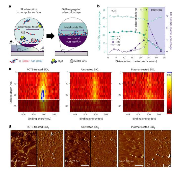 图3a显示了丝蛋白(SF)在不同表面能的基底上的吸附机制,假设疏水结构域与非极性表面相互作用,而亲水结构域则面向溶液。作者通过X射线光电子能谱(XPS)和原子力显微镜(AFM)分析了掺有不同浓度SF的溶液在不同表面上的表现。XPS结果显示,在非极性基底上,高浓度SF溶液形成了含有蛋白质的薄膜,并且在高能离子轰击下薄膜和基底界面上仍保留有N1s信号(图3b,c)。AFM分析则揭示了不同基底上的表面拓扑结构,非极性基底上呈现平躺形状,而极性基底上则显示岛状聚集体(图3d)。研究表明,SF的吸附效率受表面能和分子量影响,并可有效增强润湿性。这一适应性吸附机制有助于在不同表面上快速形成高质量金属氧化物薄膜,无需调整沉积参数。