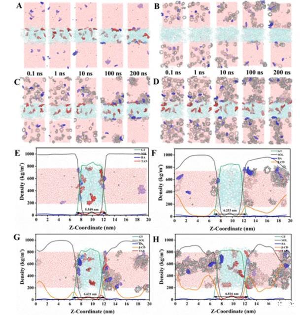 界面层厚度受分子种类、结构及密度影响显著。实验表明,实验组尤其是实验2中油相增厚,可能是由于TAN在油水界面与胆盐和β-CD发生相互作用。该现象说明β-CD与TAN之间的相互作用不仅促进了TAN向界面迁移,还揭示了BS或β-CD对TAN的吸附能力。实验组界面β-CD密度提升,说明β-CD与TAN相互吸引。动力学模拟结果表明β-CD先与TAN结合于界面,诱导胆盐围绕此复合物聚集,系统能量渐趋稳定。最终,TAN主要锚定于由胆盐与环糊精构筑的界面团聚体上,增强环糊精对胆盐的亲和力,导致环糊精与胆盐组装形成更大的聚集体,从而增加界面厚度。