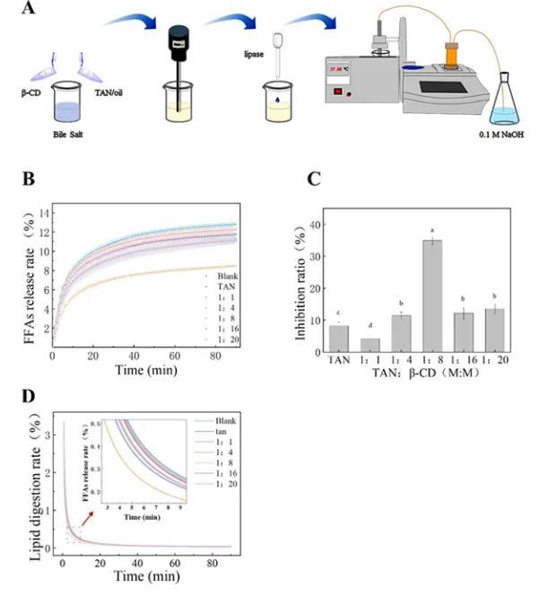 本研究发现橘皮素(TAN)和β-环糊精(β-CD)的相互作用会导致胆盐在油水界面处过度聚集,阻碍脂肪酶水解产生游离脂肪酸的释放。此外,胆盐和脂肪酶在液滴之间的置换速率降低,从而导致液滴可用于脂肪酶吸附的界面面积减少。因此,脂质消化被有效抑制。这些结果表明,表面活性抑制剂可以改变油水界面的组成、厚度和稳定性,从而抑制脂质消化。然而,TAN与β-CD相互作用形成的复合物及其与胆盐结合后的结构和共组装特性有待进一步研究。本研究从界面角度揭示TAN和环糊精在脂质消化中的作用机制,为香料分子和环糊精的健康食品开发提供理论支持。