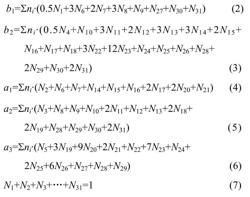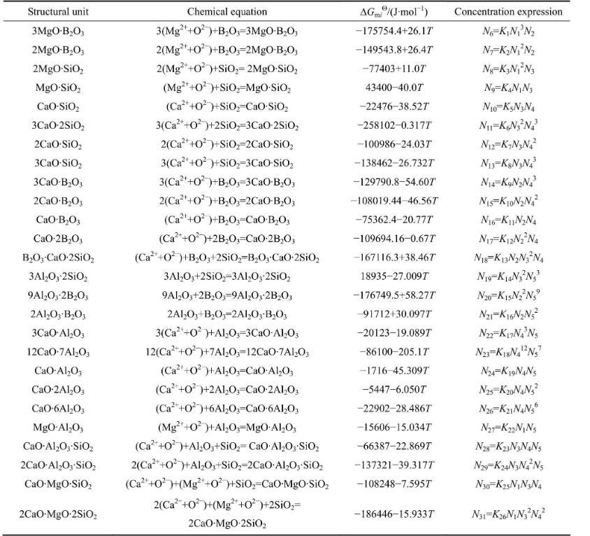 根据共存理论以及上述确定的MgO-B2O3-SiO2-CaO-Al2O3富硼渣体系熔渣中存在的结构单元,定义熔渣中成分分别为。结构组元作用浓度符号表示为: