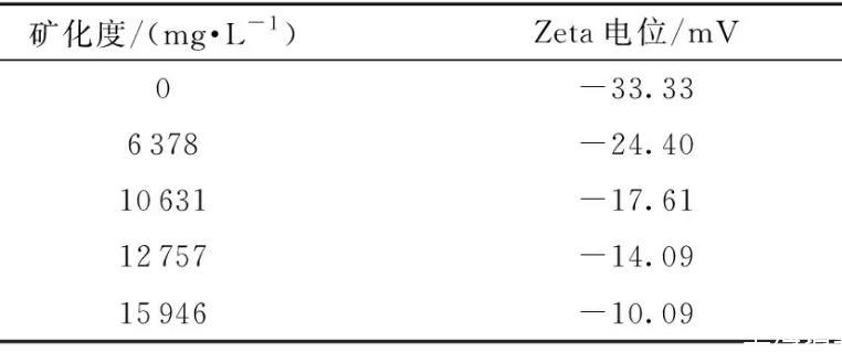 矿化度/(mg·L-1)Zeta电位/mV0-33.336378-24.4010631-17.6112757-14.0915946-10.09