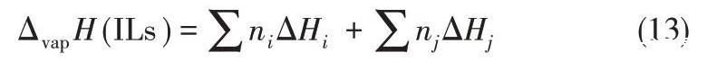 在之前的工作中,Verevkin等[71]已经提出了用简单相加法估算ILs蒸发焓,他们还建立了蒸发焓的经验基团贡献方程,尽管简单,但与所研究流体的实验结果差异不超过5 kJ·mol-1。在此基础上,Zaitsau等[73]开发了一种简单的基团贡献方法来预测烷基咪唑类ILs的汽化焓,在这个工作中,他们参考了实验结果和文献数据,给出了每个基团的贡献值,可以直接进行加和计算。