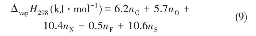 2005年,Kabo等[37]用Knudsen渗流法测出了[C4mim][Tf2N]的蒸气压,从而计算得到汽化焓,Kabo等基于有效原子的相加性提出式(9)计算298 K的汽化焓