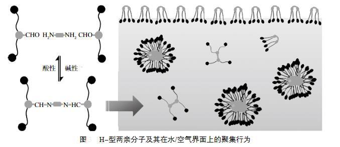 另外一类是含有活性可断裂键的表面活性剂,其中亚胺键是一类比较典型的动态共价键。许多新颖的基于亚胺键构筑的H-型两亲分子,其中亚胺键用于连接两个Bola型的两亲分子,H-型两亲分子自组装可形成胶束,当pH从碱性调至弱酸性时,亚胺键发生水解,从而导致两亲分子的解离以及不同聚集体形态之间的转变。