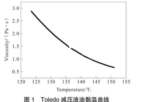 考虑到上述因素,本文在根据现有仪器测得的相对较低温度条件下的黏温曲线关系的基础上进行了减压渣油较高温度条件下黏温关系的计算近似,以求对减压渣油反应模型进行较为准确的理论模型建立的指导。就目前的技术而言,在缺少直接测量仪器以及相关行业标准的情况下,利用模型进行计算模拟近似,是最具说服性地技术手段。图1为实验室中实际测得的在相对较低温度下Toledo减渣的黏温曲线。