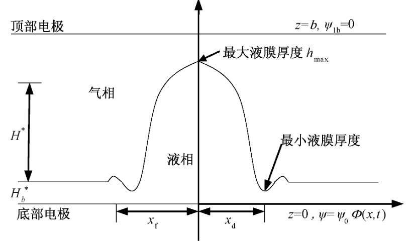 上述研究表明,电场强度对表面张力的影响大致分为表面张力随电场强度提高而减小、增大和不变等三种情形。而目前对于受电场作用时的液滴运动的理论研究中,均假设表面张力不受电场影响,即表面张力不变,进而模拟其运动特征;这显然与上述多数实验所得结论明显不符,也不能准确反映电场对液滴运动的影响。为此,本文基于实验研究结果,建立表面张力与电场强度间的关系式,推导电场作用下描述液滴运动过程的演化方程,采用数值模拟获得不同电场情形下的液滴运动行为,进而分析因电场作用带来的表面张力变化对液滴运动特征的影响。