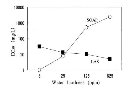 在预测试中,大型水蚤在 4 盐混合中存活 溶液,但不能在 CaCl2・H2O 溶液中存活,也不能 蒸馏水。 另一方面,罗汉松在所有 3 种水中都能存活。 因此,罗汉果被用来 检查水硬度成分对 LAS 和 SOAP 的毒性。 如图 3 所示,CaCl2・H2O 之间没有观察到毒性值的差异 溶液和四盐混合溶液。 肥皂的毒性 随着水硬度的增加而降低,和 LAS的毒性随着水硬度的增加而增加。