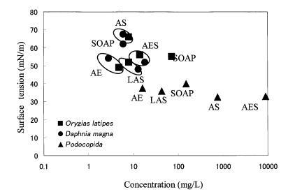 图 2 水生毒性(LC50 或 EC50)和毒性 5 种表面活性剂对 3 种水产品的表面张力 25 ppm 硬度水中的物种。