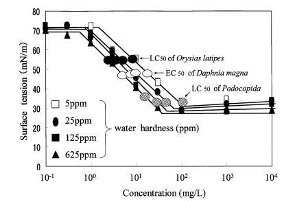 图 9 水硬度对表面张力的影响 烷基硫酸盐和有毒表面张力曲线 Daphnia Magna 的价值。