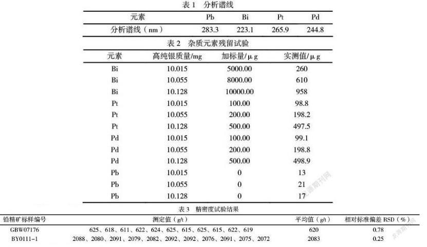 本方法对铅、铋、铂、钯各元素的分析谱线采用仪器推荐的分析谱线进行试验,元素及相应的分析谱线见表1。