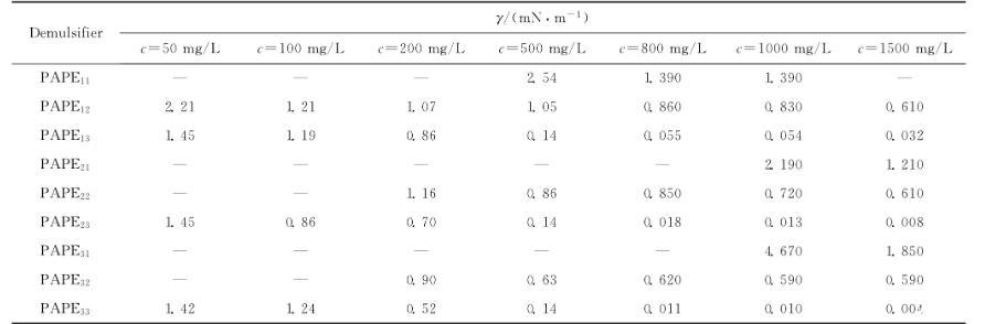 PAPE11、PAPE12和PAPE13是相对分子质量相当、HLB值逐渐增大,亦即其亲水性逐渐增强的3个破乳剂样品。从表3还可以看出,在同样的破乳剂浓度下,HLB值越大的破乳剂降低油-水界面张力的幅度越大,油-水界面张力越低,甚至发生数量级的变化;而要将油-水界面张力降低至同样的水平,HLB值大的破乳剂所需要的浓度则更低,即其降低油-水界面张力的效率越高。PAPE21、PAPE22和PAPE23以及PAPE31、PAPE32和PAPE332个系列的破乳剂随着HLB值的增大也表现出同样的规律。PAPE12、PAPE22和PAPE32是保持HLB值相当、相对分子质量逐渐增大的3个破乳剂样品,随着相对分子质量的增大,它们降低油-水界面张力的能力均有所增强,但增强的幅度不大,大体均在同一数量级内变化。PAPE13、PAPE23和PAPE33是水溶性最好的一组破乳剂,随着相对分子质量的增大,其降低油-水界面张力的能力也有所增强,但增强幅度仍然不大。由此可见,在所研究的破乳剂相对分子质量变化范围内,相对分子质量变化对PAPEmn界面活性的影响较小。