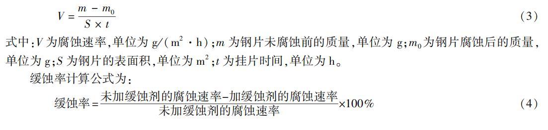 酸化是油气田增产增注的重要措施之一,在石油工业中得到了广泛的应用。酸化使用的酸液注入地层的过程会严重腐蚀地面管道及井筒管壁,而且Fe3+会对地层产生永久损害,所以酸液中必须加入缓蚀剂。本实验参照《酸化用缓蚀剂性能试验方法及评价指标》,采用静态挂片法,对已提纯的合成产物BQAS进行缓蚀性能研究。挂片法是在实验室给定条件下,通过用试片的质量损失计算出腐蚀速率和缓蚀率,来研究缓蚀剂缓蚀性能的方法。