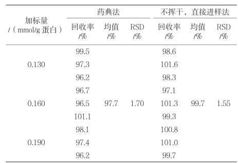 由表3可知,药典方法测得的9次回收率的平均值为97.7%,RSD值为1.70%;不挥干,直接进样法测得的9次回收率的平均值为99.7%,RSD值为1.55%。对两组数据进行单因素方法分析,F=7.530,P=0.02<0.05,两组数据有显著性差异。方法优化后准确度更接近100%,这是因为优化后的方法不受挥干速度的影响[3],进样溶液比药典方法均匀,损失量相对较小。