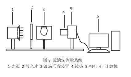 悬滴法的原理是利用液滴静止悬挂在毛细管的管口处时,液滴的外形主要取决于重力和表面张力的平衡。通过测定悬挂着的液滴的外形参数,可推算出液体表面张力。悬滴法的测量试验系统主要由光源、散光片、液滴形成装置、镜头、相机、计算机等组成。测试步骤也很简单,不需要清洗仪器,制样完成后,接通电源,调节控温器使温度达到预设温度点。将装好试样的石英比色皿和注射器置于恒温室中,针头必须保持垂直。一般液体恒温时间为 30 min。控制注射泵进样成滴,当液滴接近最大直径时,按动快门,记录液滴图像,将摄影胶片印制成图像。该检测方法表面张力测定精度也是±0.1% 。此外要注意管尖的口径不能过大以致生成大悬滴,温度波动会产生对流和振动,使悬滴不稳定。