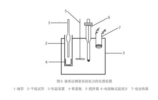 滴重法是利用液滴重量与支持它的表面张力的力相平衡进行测定的试验。主要也是因为表面张力与液滴重量、滴管半径、液体密度及重力加速度相关。滴重法要使用到的仪器主要玻璃滴管、恒温装置、平底试管、称量瓶、搅拌器、电接触式温度计、电加热器等。试验步骤也是先配置测定溶液,清洗测量仪器,然后安装好实验装置,启动搅拌器,调节接触温度计,至所需温度,使水恒温半小时,要求普通温度计的误差不超过±0.5 ℃。恒温足够时间以消除平底试管内与水温的差,一般温差小于 1 ℃。用分析天平称得洁净干燥的称量瓶空瓶重。放入浸入恒温装置的平底试管内。将橡皮管套于移液管的未加工端,用吸球将待测液吸入移液管内,用夹子夹住橡皮管不使待测液滴下然后将移液管垂直悬挂入恒温装置内的试管中,但不可与称量瓶接触。恒温半小时后,慢慢旋开夹子,让液体自然滴下,调节水滴的下落速度至每滴 100-120 s。至20 滴时拧紧夹子,取出移液管。将称量瓶称重,减去空的称量瓶重量,求得每液滴的重量。在同一温度下重复两次。对于表面张力能随时间迅速变化的或者界面能够迅速相互饱和的界面,测定精度为±0.1%。